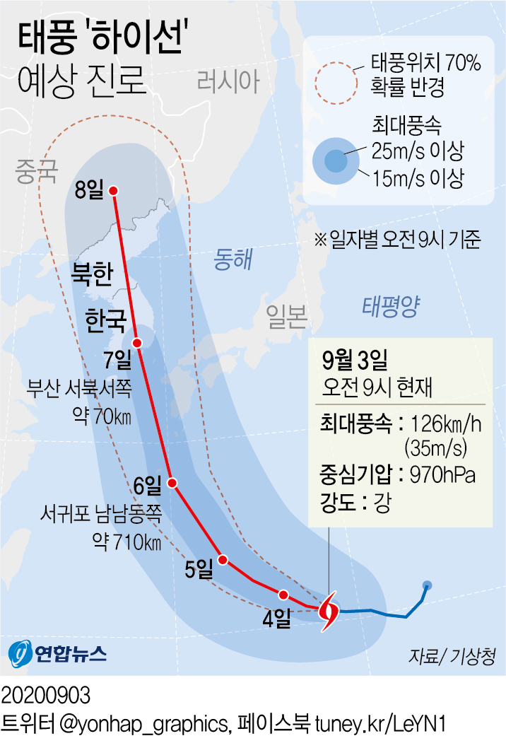 제10호 태풍‘하이선(Haishen)’이 북상함에 따라 주말부터(9.5.~9.7.) 경상남도 지역에 영향을 줄 것으로 예상됩니다. ※ 매우 강한 바람과 많은 비가 예상됨[예상강수량 50~100mm(많은 곳 300mm 이상)] 전교생들은 아래 사항에 유의하여 주시기 바랍니다.