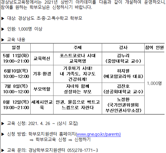 '2021년 상반기 경남학부모 아카데미' 신청 안내