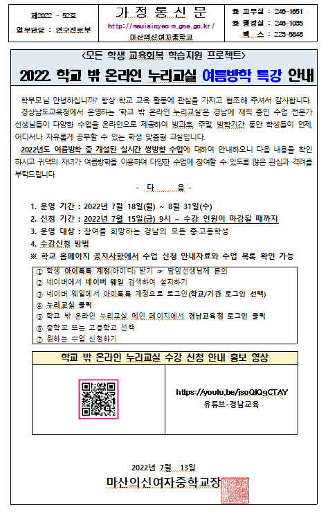2022. 학교 밖 온라인 누리교실 여름방학 특강 가정통신문.hwp