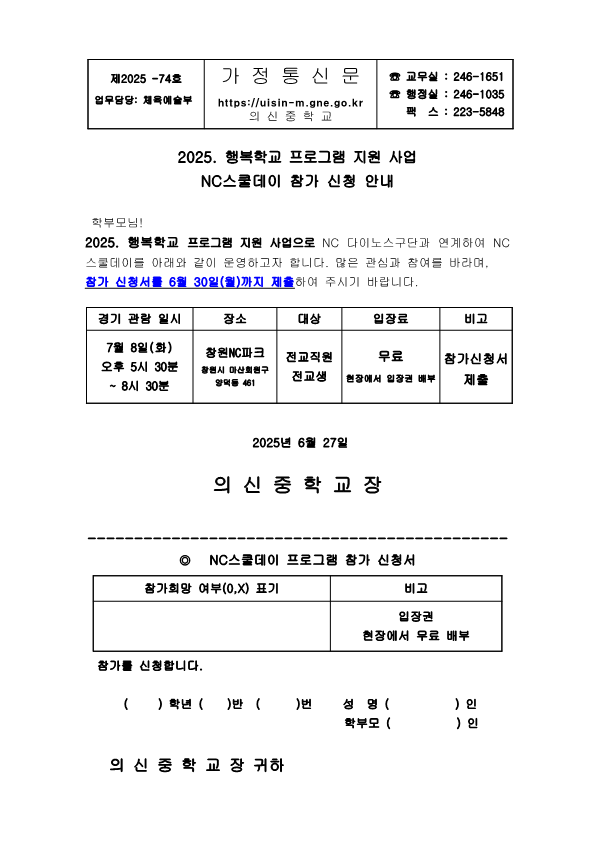 2025. 행복학교 프로그램 지원 사업 NC스쿨데이 참가 신청 안내 가정통신문입니다.
