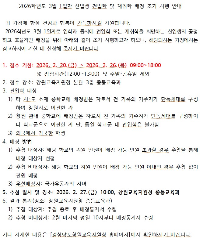2026학년도 3월 1일자 신입생 전입학 및 재취학 배정 조기 시행 안내